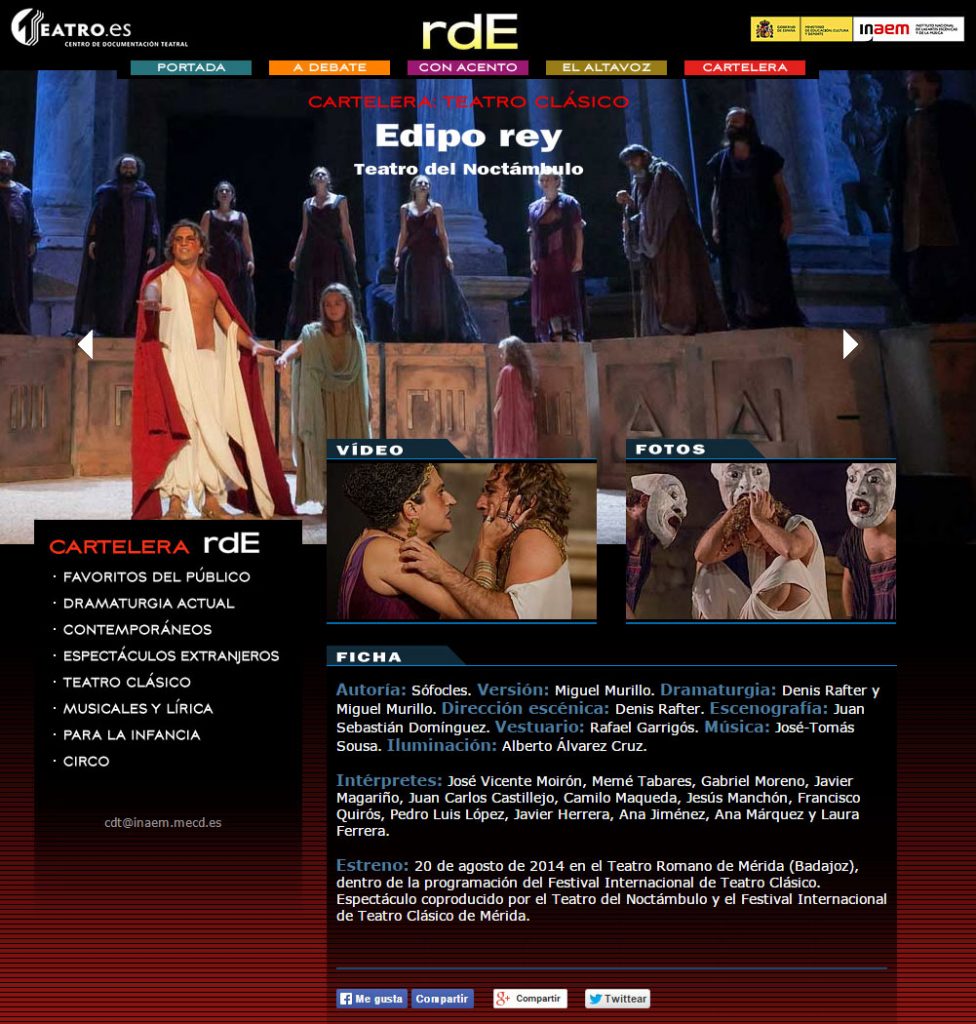 19/08/2014Ficha en la web www.teatro.es el Centro de Documentación Teatral, dependiente del Instituto Nacional de las Artes Escénicas y de la Música (INAEM) es el organismo de la Secretaría de Estado de Cultura que se ocupa de articular y desarrollar los programas relacionados con el teatro, la danza, la música y el circo.